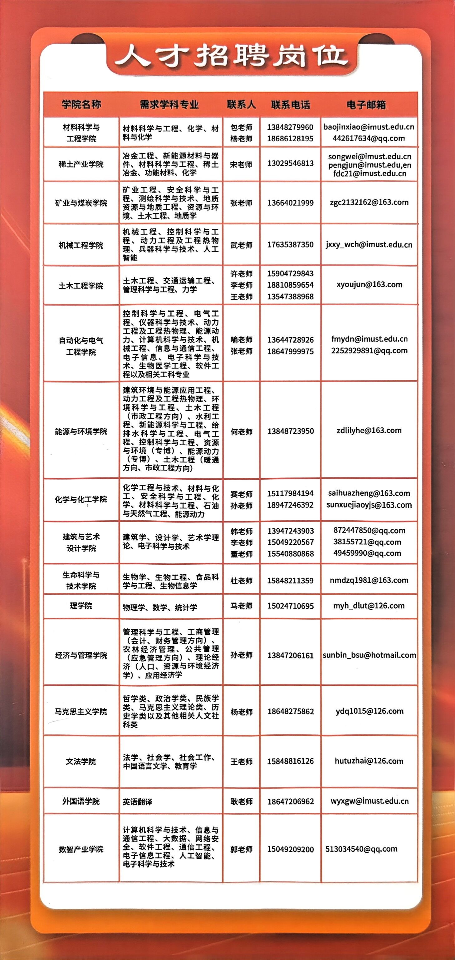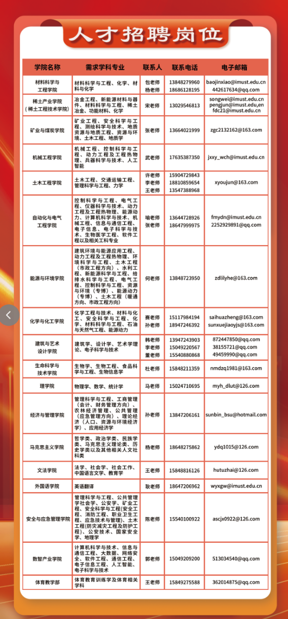 学校现有稀土产业学院、安全与应急管理学院、冶金未来技术学院、能源产业学院、硅业学院、数智产业学院、绿色基建产业学院7个现代产业学院。有材料科学与工程、矿业工程2个博士后科研流动站。有冶金工程、矿业工程、机械工程、材料科学与工程等4个博士学位授权一级学科。有硕士学位授权一级学科19个,专业硕士学位授权类别11个。有4个自治区一流建设学科,2个自治区优势特色学科,6个提质培育学科。